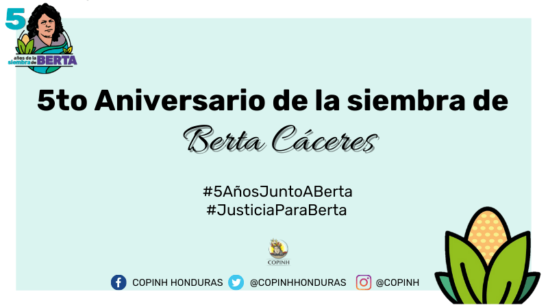 Este 5to aniversario, como todo los años, con la fuerza ancestral de Berta, Lempira, Mota, Iselaca y Etempica, seguiremos levantando nuestras voces llenas de justicia, libertad, dignidad y paz.